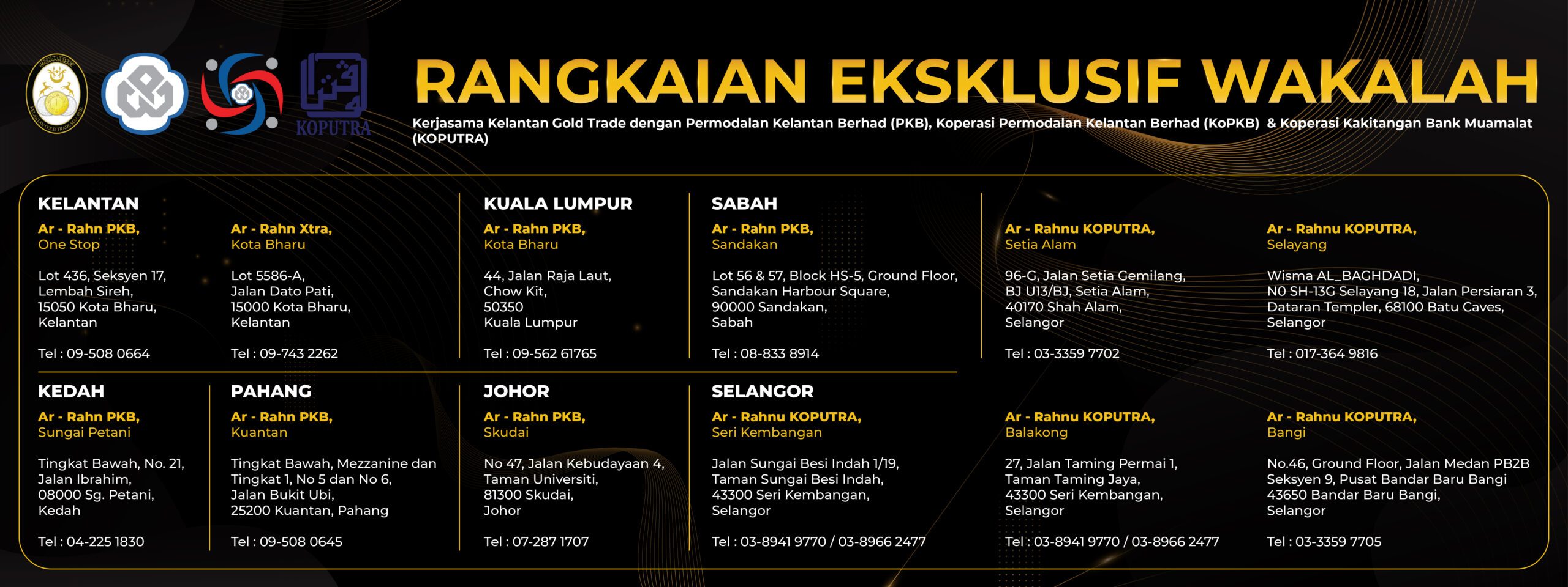 Wakalah yang dilantik oleh Kelantan Gold Trade akan menjalankan kaunter Dinar & Dirham bagi pihak KGT dan memudahkan pelanggan untuk mendapatkan fizikal produk keluaran Kelantan Gold Trade di seluruh Malaysia.