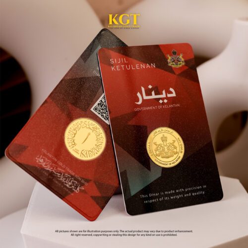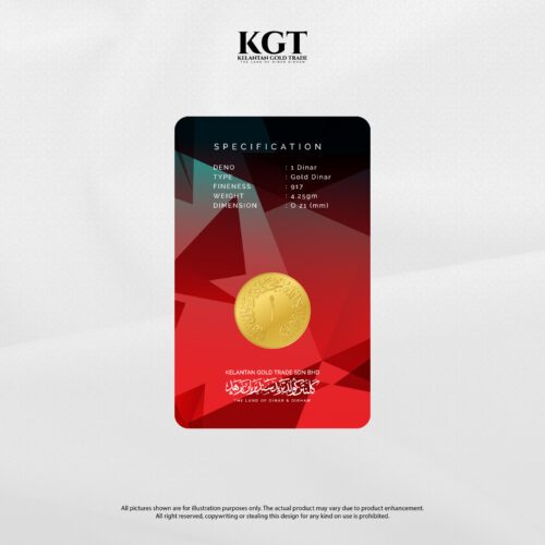 Produk 1 Dinar ini ditempa halus dengan ukiran kalimah agung (shahadah), denominasi, lambang negeri, dll. Pembelian disertakan bersama kantung merah yang menawan seakan-akan dalam drama bersiri Payitaht: Abdülhamid!